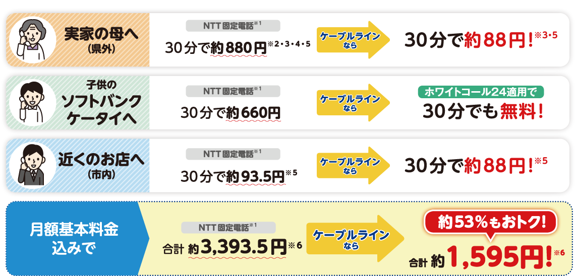 ケーブルラインからソフトバンク携帯電話への国内通話が24時間無料となるサービス。* *着信転送サービス(付加サービスパック1および2を含む)と併用した場合、転送先にソフトバンク携帯電話をご指定いただいても転送にかかる通話料は通常通り発生しますのでご注意ください。 |